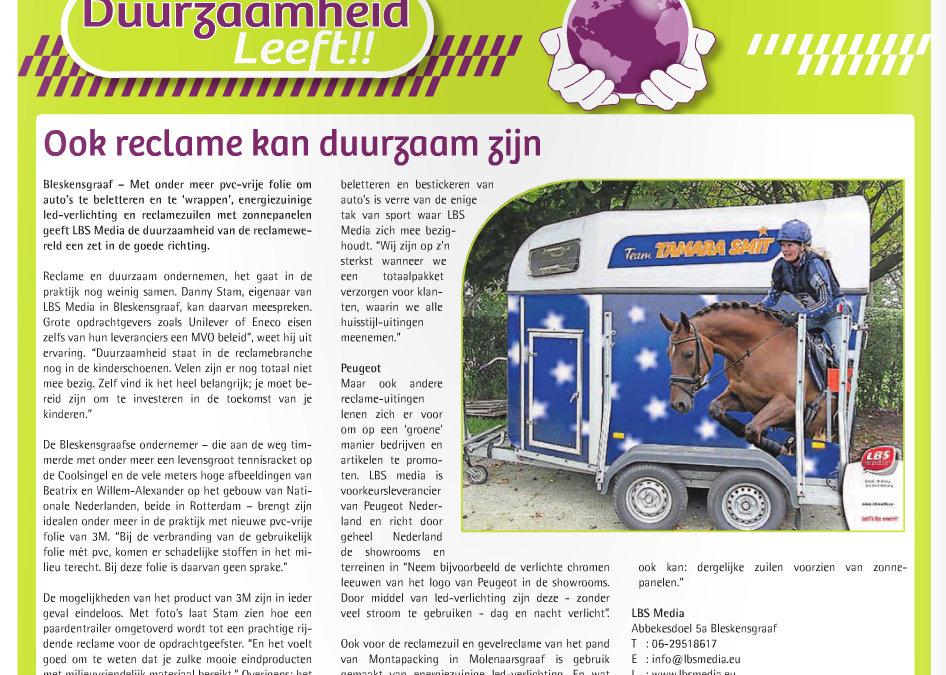 Ook reclame kan duurzaam zijn. Bij Het Kontakt deze week een speciale bijlage “Duurzaamheid Leeft!” met een artikel over LBS media.