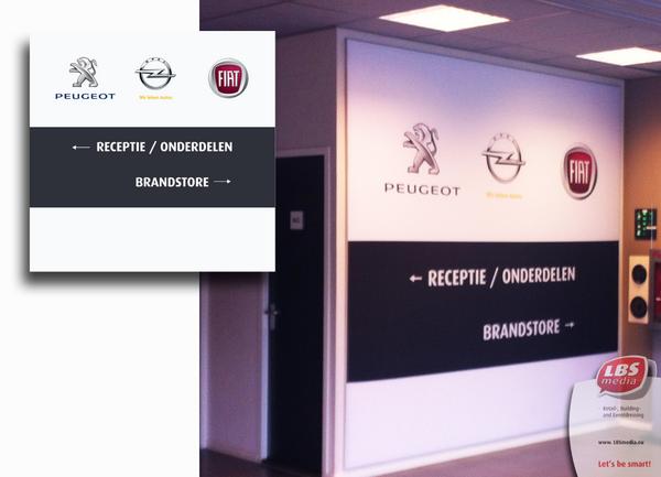 Doeltreffende en praktische bewegwijzering dmv sfeervisual op wand bij combinatie brandstore Fiat, Opel en Peugeot