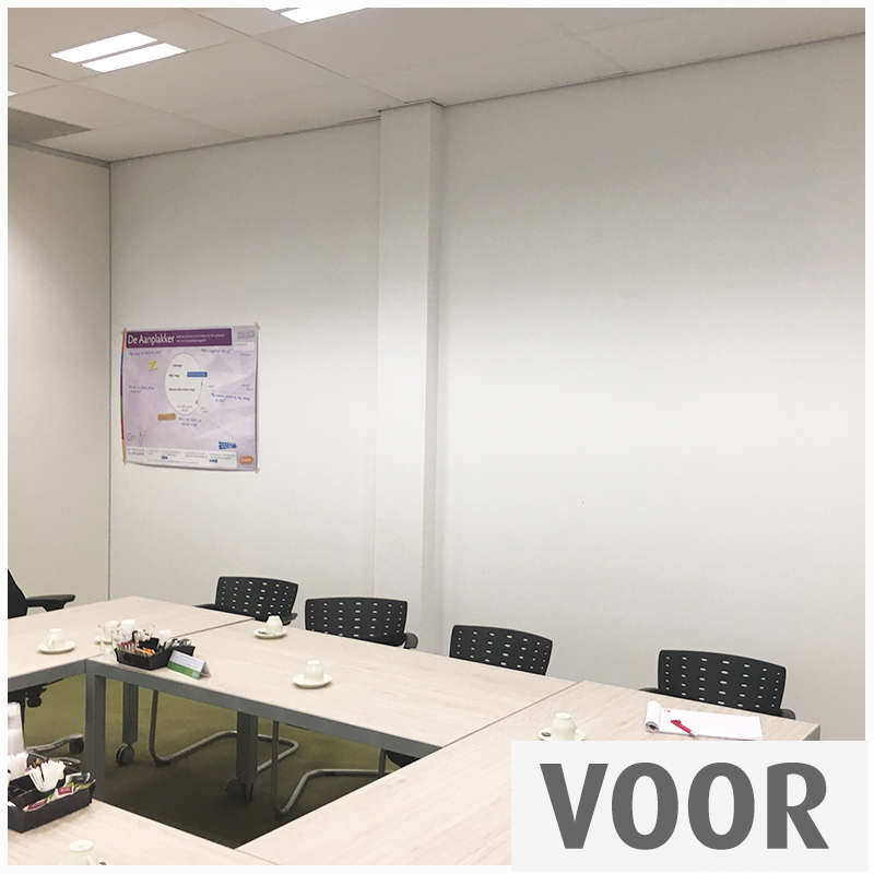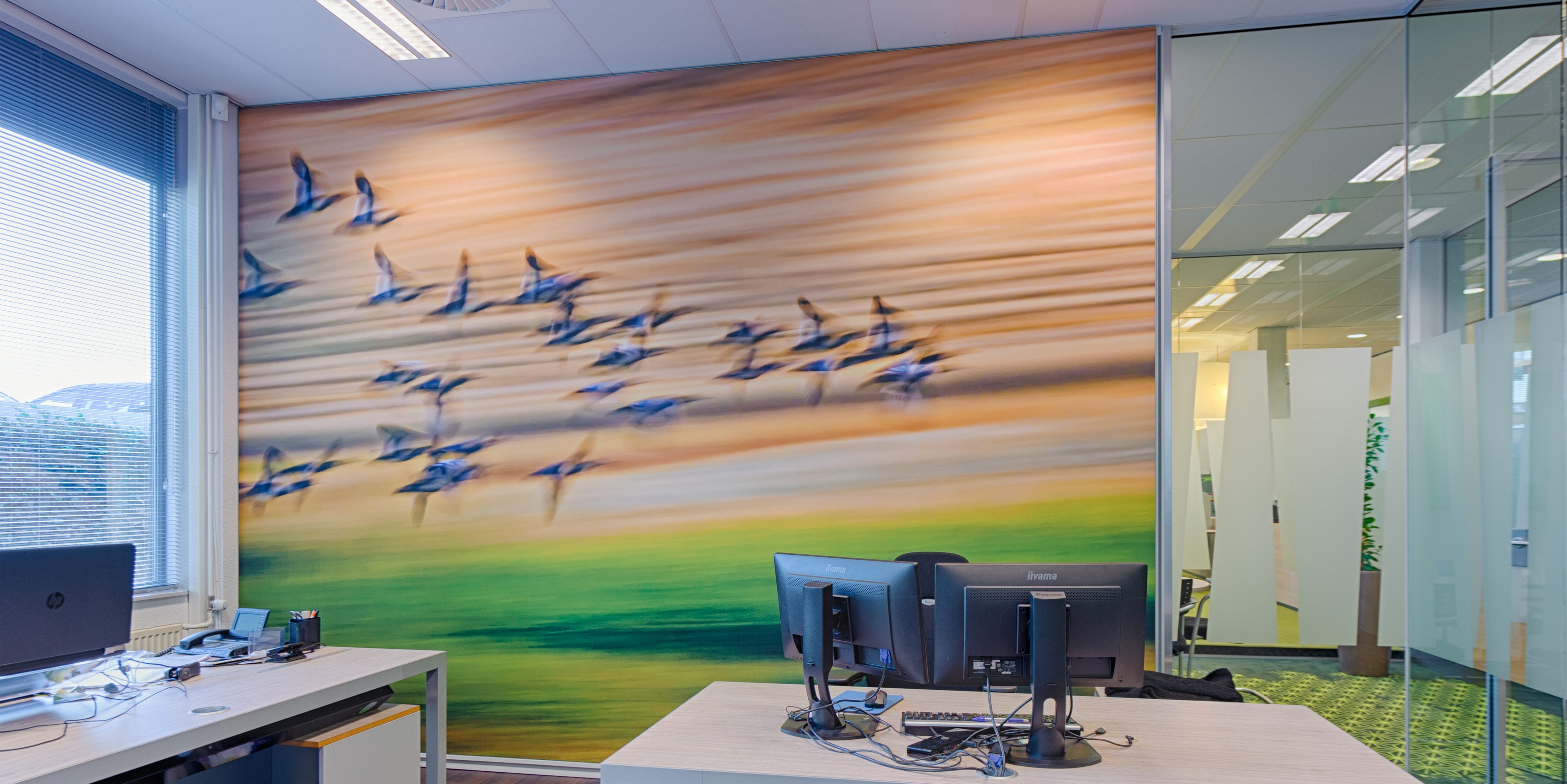 De frisse en moderne beelden in de kantoorruimten zorgt voor sfeer, terwijl het originele patroon op de glazen systeenwanden zorgt voor dynamiek en een gevoel van privacy.