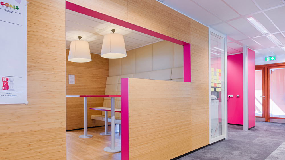 De frisse magenta kleur in combinatie met meters lange whiteboard folie op de wanden, zorgt dat overal de uitstraling van T-Mobile terugkomt.
